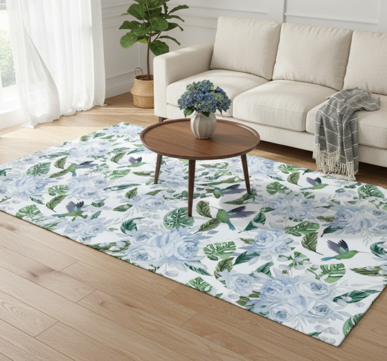 Alfombra vinílica flores jardín azul con pájaros