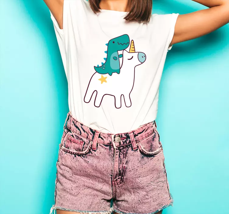 ¡Descubre la camiseta aventura de unicornios fantásticos! Este diseño espectacular cuenta con un vibrante unicornio y un juguetón dinosaurio, rodeados de estrellas que parecen saltar de la tela. La ilustración en estilo de dibujos animados da vida a estos amigos mágicos, creando un look vistoso y lindo que encantará a grandes y chicos. ¡Es la elección perfecta para quienes buscan un toque de diversión y magia en su vestuario!