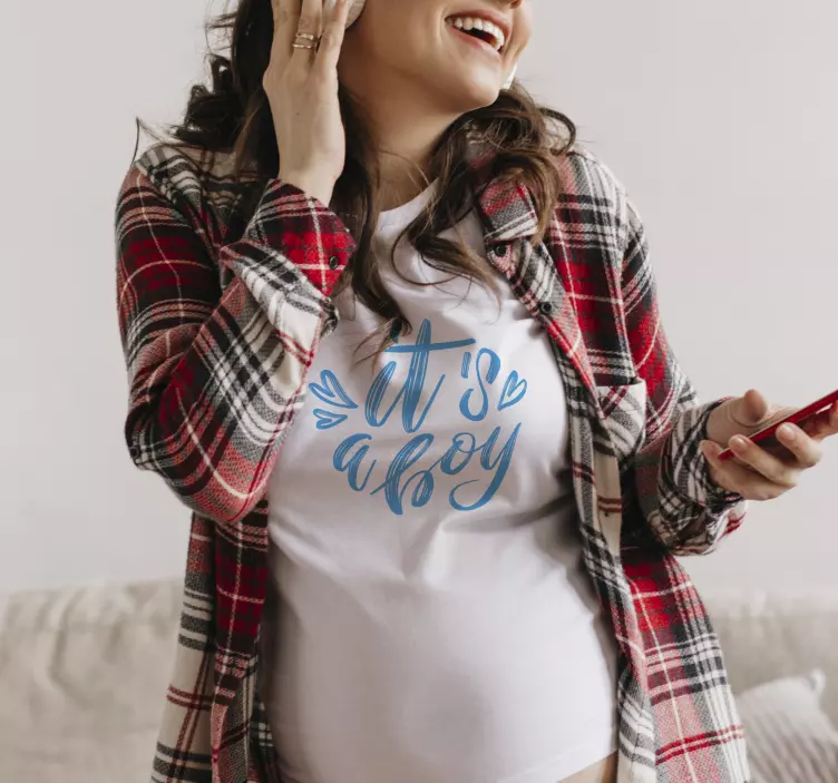 Referencia: T4442Esta imagen presenta a una madre alegre sosteniendo un teléfono mientras lleva una camiseta de maternidad especial que expresa la emoción por la llegada del bebé. El diseño alegre resalta la frase 'It's a boy' en una fuente elegante, lo que lo hace perfecto para celebrar revelaciones de género o hitos del embarazo.