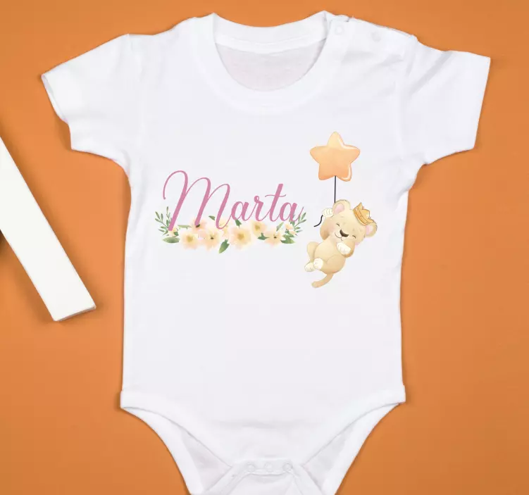 Referencia: T5219Este encantador diseño presenta un lindo oso sosteniendo un globo en forma de estrella, complementado con delicados elementos florales. El nombre 'Marta' está elegantemente integrado en la obra, creando un toque alegre y personalizado, perfecto para ropa de bebé.