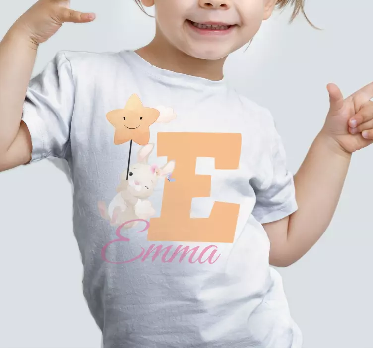 Referencia: T4701Este encantador diseño presenta un alegre conejo sosteniendo un globo en forma de estrella, acompañado de la letra 'E' y un nombre personalizado. Perfecto para ocasiones especiales, irradia alegría y diversión, convirtiéndose en una elección ideal para los más pequeños.