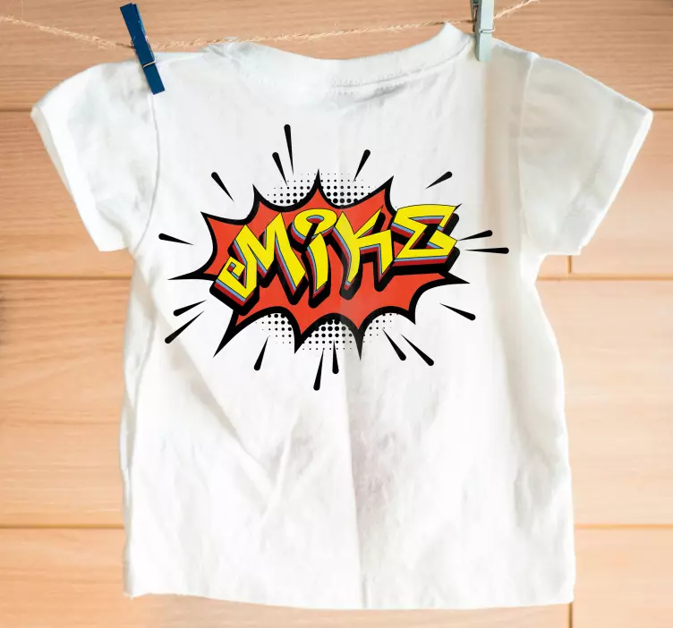 Referencia: T4538Este diseño juguetón presenta una explosión vibrante al estilo cómic con el nombre 'Mike' destacado de manera prominente. Los colores audaces y las formas dinámicas crean un atractivo enérgico, perfecto para una atmósfera divertida y alegre para los niños.