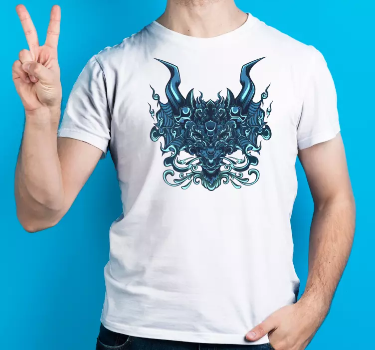 Referencia: T4806Este gráfico impactante presenta una criatura cornuda intrincadamente diseñada en tonos de azul profundo. La ilustración detallada muestra una fusión de elementos feroces, lo que la hace ideal para quienes buscan una apariencia única y poderosa. Perfecto para hacer una declaración con su toque dramático.