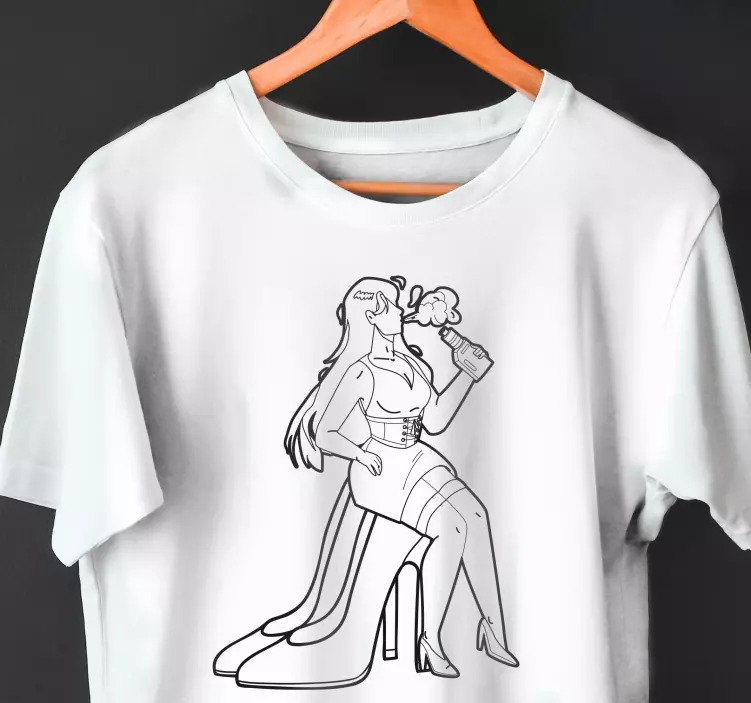 La camiseta estilo de tacón elegante es una obra de arte que combina moda y creatividad en una prenda única. Con un diseño que muestra una mujer con una silueta delicada, dibujada a mano, esta camiseta destaca por su elegante ilustración de tacones altos y un bosquejo que sugiere sofisticación. La imagen, que evoca la esencia de un cóctel chic, incluye detalles de fumador y un vaporizador, creando una atmósfera de seguridad y estilo.