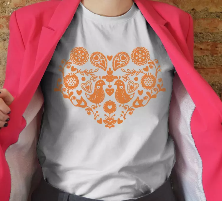La camiseta pájaros con patrón de corazón es una verdadera obra de arte que fusiona elementos del folklore polaco con un diseño vibrante y lleno de amor. Este modelo presenta un hermoso patrón en blanco y negro que incluye aves, flores y un delicado corazón, evocando la tradición y la belleza de la naturaleza. Es una prenda que no solo se viste, sino que se siente, perfecta para quienes valoran el estilo y la cultura en su día a día.