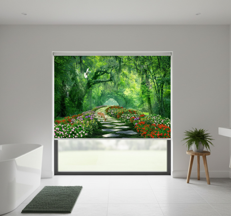 Cortina roller árboles sendero del bosque surrealista