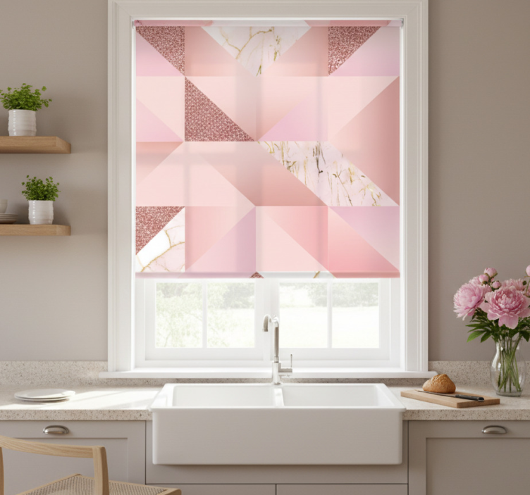 Cortina roller cocina mármol rosa dorado