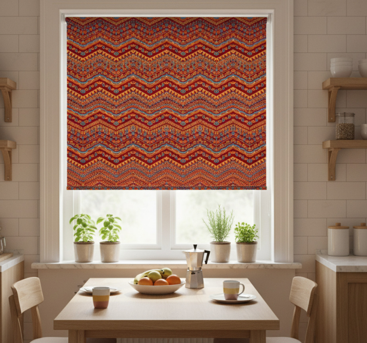 Referencia: E6347La Cortina roller cocina patrones tribales rojos presenta un diseño vibrante y contemporáneo, donde los patrones tribales en tonos rojos evocan energía y calidez, convirtiendo cualquier cocina en un espacio acogedor y lleno de estilo. Su atractivo visual se complementa con su funcionalidad, protegiendo del sol y brindando privacidad sin sacrificar la estética.
