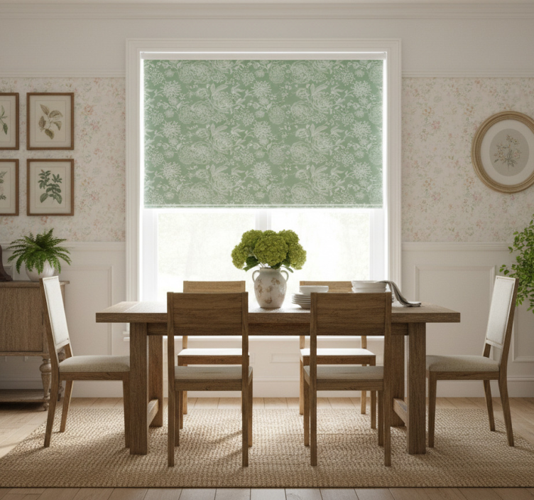 Cortina roller comedor estilo grandmillenial floral verde