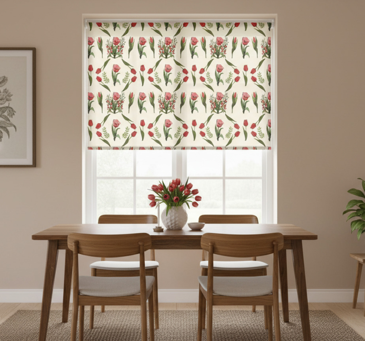 Cortina roller comedor primavera con tulipanes rojos