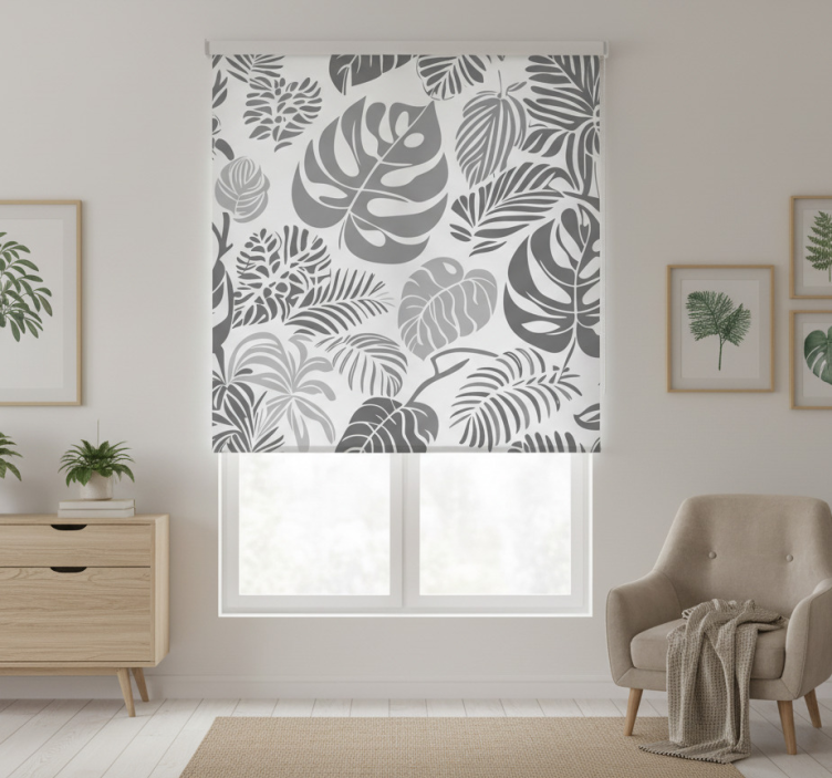 Cortina roller gris hojas de monstera