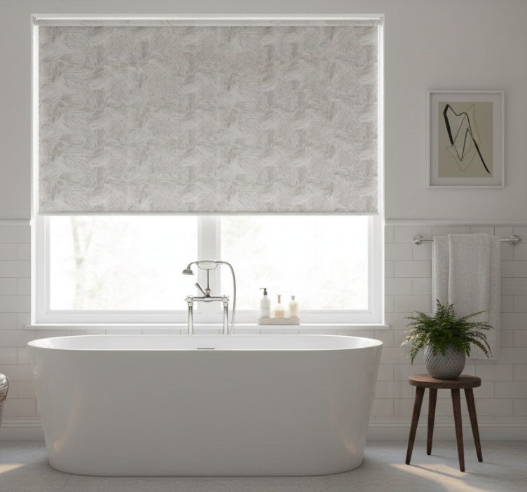 Cortina roller gris patrón hexagonal mármol dorado