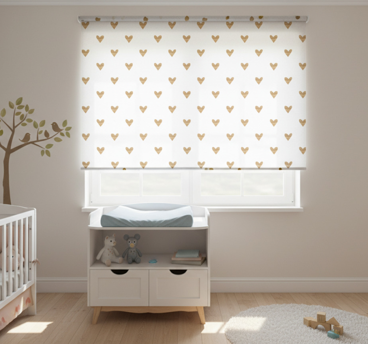 Cortina roller infantil corazón dorado sobre fondo blanco