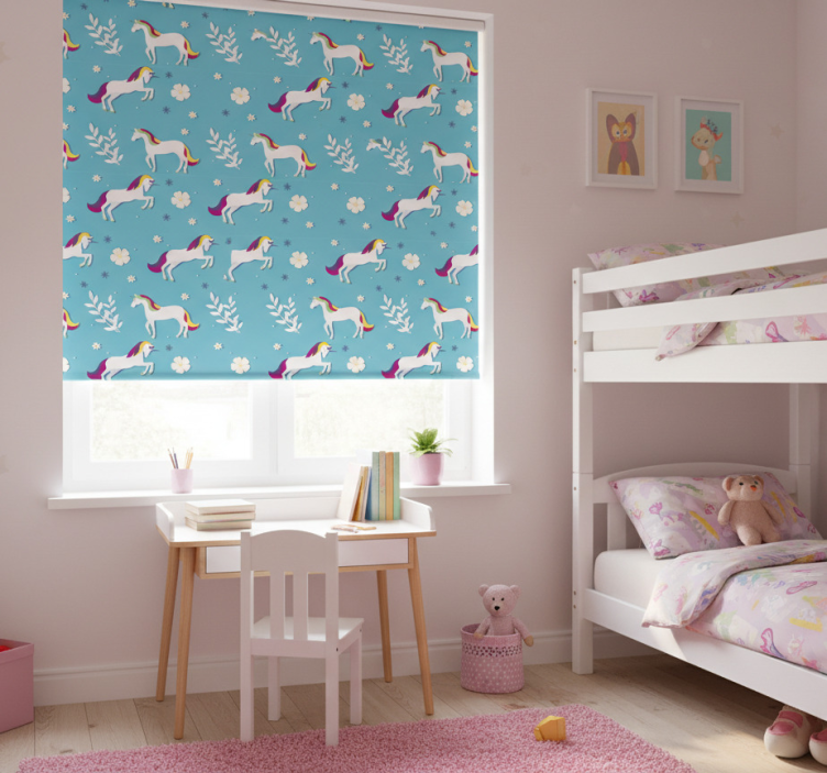 Cortina roller infantil patrón de unicornios en poses