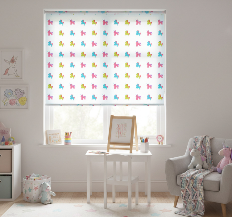 Cortina roller infantil unicornios sobre fondo azul