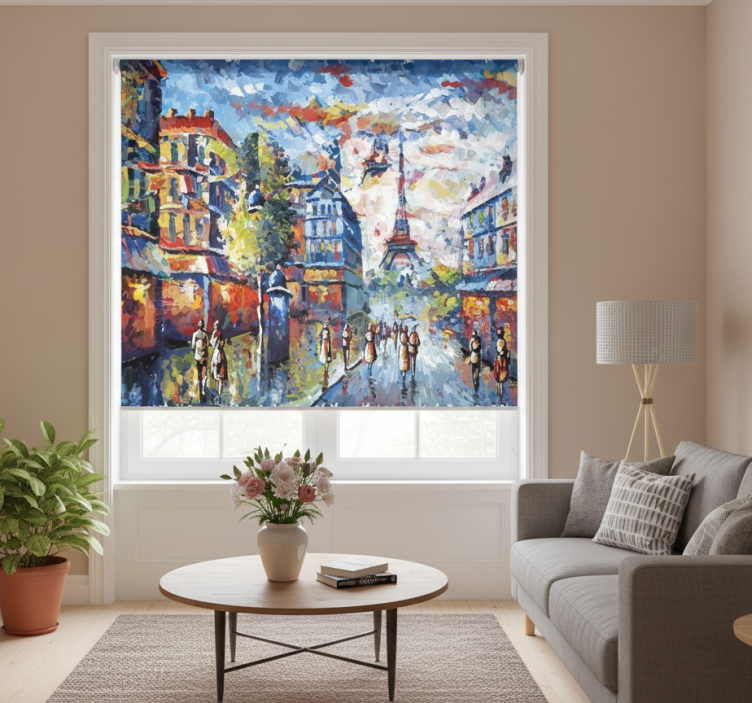 Cortina roller living comedor arte parís bohemio acuarela