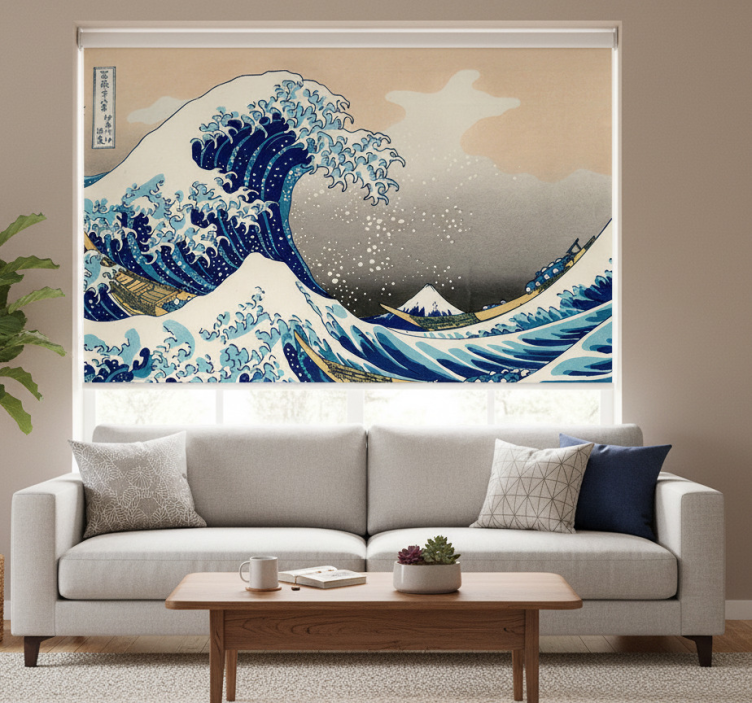 Referencia: E8865La Cortina roller living comedor mural de la ola hokusai es una pieza única que transforma tu espacio con un diseño inspirador basado en la famosa obra de Hokusai. Esta cortina presenta un hermoso mural que captura la esencia de la ola, combinando elegancia y arte en un solo producto. Su textura suave y su acabado de alta calidad hacen que sea un elemento decorativo perfecto para cualquier living o comedor.