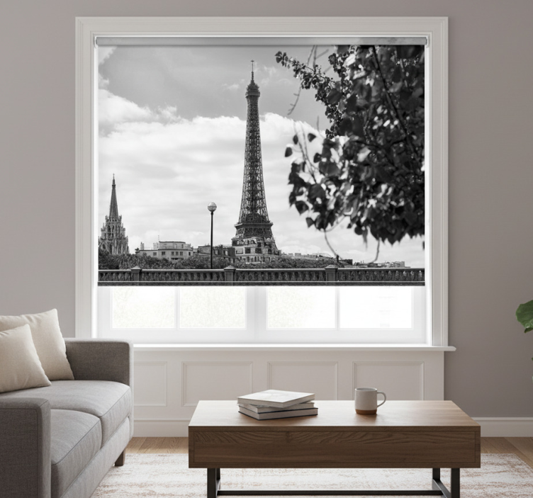Cortina roller living comedor torre eiffel en blanco y negro