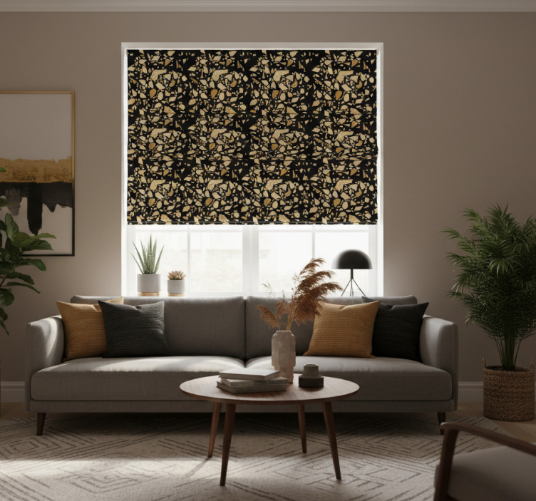 Referencia: E7685Descubre la elegancia de la Cortina roller moderno estilo terrazzo negro y dorado, un diseño que combina la sofisticación del negro con el brillo del dorado. Su patrón terrazzo, lleno de matices y texturas, transforma cualquier espacio en un refugio contemporáneo y acogedor. Ideal para quienes buscan un toque distintivo en su decoración, esta cortina no solo es funcional, sino que también se convierte en una obra de arte para tus ventanas.