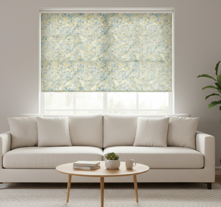 Cortina roller moderno geométrico beige azul y amarillo
