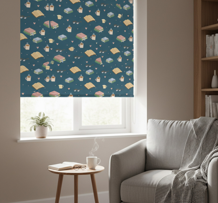 Cortina roller moderno té libros y café