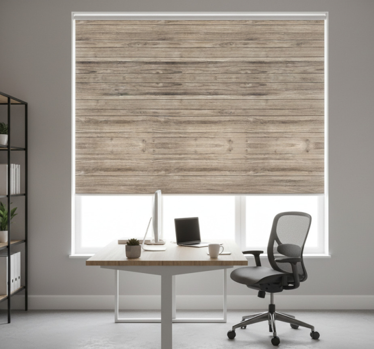 Cortina roller oficina tablones de madera gris rústico