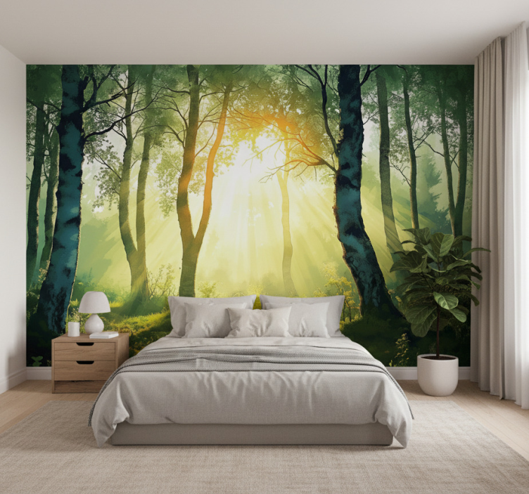 Mural de bosque abedul bañado por el sol