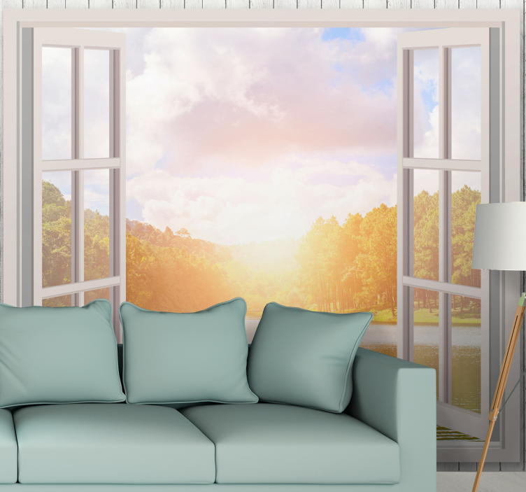 Descubre el Mural de naturaleza amanecer sobre el lago, un diseño cautivador que transforma cualquier espacio en un refugio de tranquilidad. Con una hermosa ventana que ofrece una vista mágica del amanecer sobre el lago, rodeado por un frondoso bosque y árboles que se reflejan en el agua, este paisaje es un auténtico trampantojo que invita a la serenidad. La combinación de colores mate añade un toque de elegancia y calidez, haciendo que cada mañana sea un deleite visual.