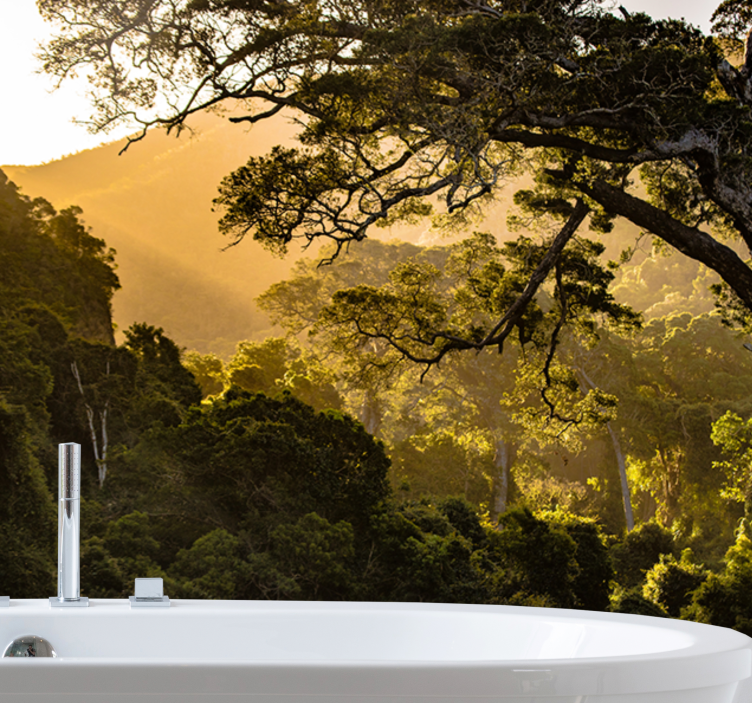 Descubre la belleza del Mural de naturaleza escenario de bosque verde, un diseño que evoca la serenidad de un bosque encantado, donde los árboles se elevan majestuosamente bajo la cálida luz de sol, creando un paisaje lleno de vida. Las montañas al fondo añaden un toque de grandeza, mientras que la luz natural transforma cualquier espacio en un refugio de paz y armonía.
