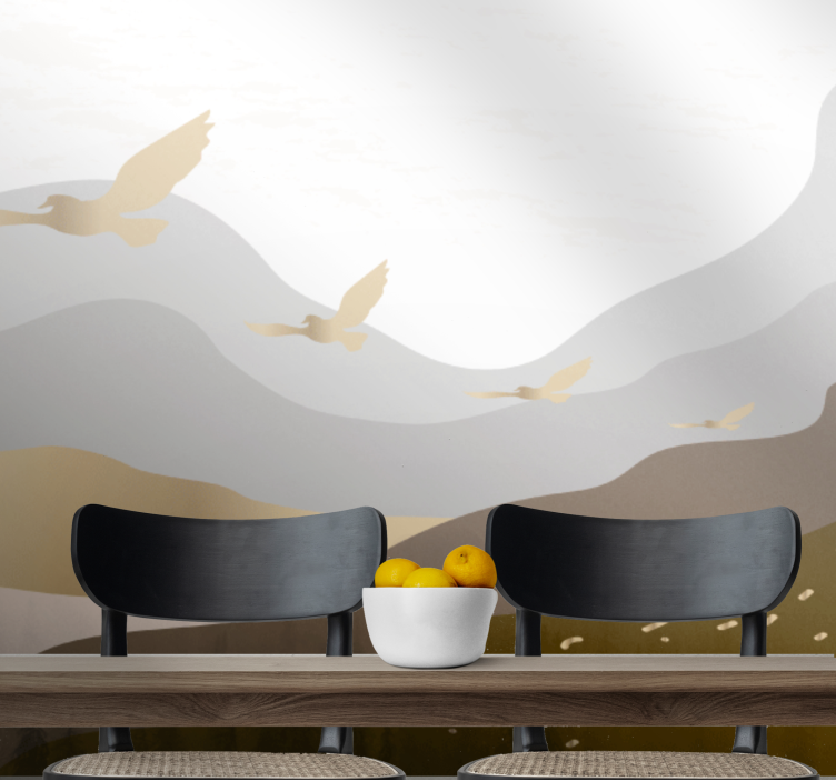 Descubre la magia de la naturaleza con nuestro Mural de naturaleza siluetas de aves volando. Este impresionante diseño presenta una elegante ilustración de aves volando sobre majestuosas montañas, donde las siluetas doradas de los pájaros se fusionan con el esplendor del entorno natural. La combinación de elementos crea un ambiente sereno y acogedor que transformará cualquier espacio en un refugio lleno de vida.