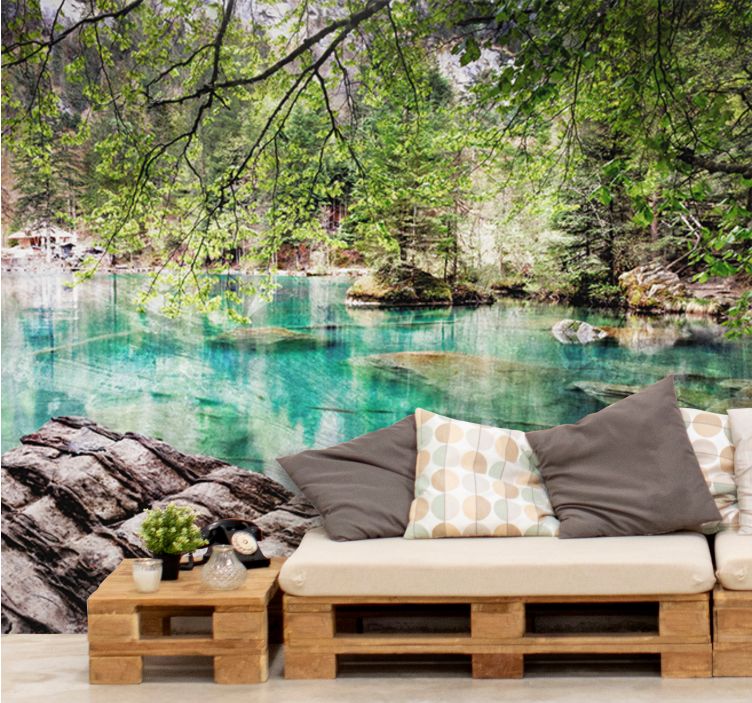Descubre la belleza serena del mural de paisajes escena de lago tranquilo, donde un lago cristalino se encuentra con árboles frondosos y un bosque vibrante. Esta fotografía cautivadora captura la esencia de la naturaleza, con suaves reflejos en el agua y rocas que adornan el paisaje. Perfecto para quienes desean llevar un pedazo de calma y armonía a su hogar.