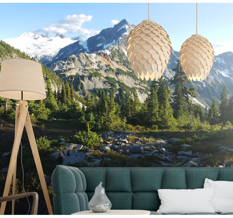 Transforma tu espacio con el Mural de paisajes vista del bosque montañoso, un diseño cautivador que evoca la majestuosidad de las montañas cubiertas de nieve, rodeadas de árboles frondosos y la pura esencia de la naturaleza. Este paisaje te sumergirá en un bosque encantador, creando una atmósfera serena y relajante en cualquier habitación de tu hogar.