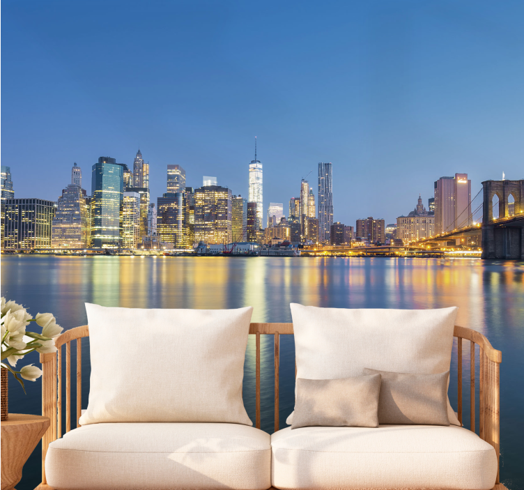 Sumérgete en el vibrante panorama de Nueva York con nuestro espectacular Mural New York puente de brooklyn y skyline urbano. Este diseño cautivador presenta un reflejo deslumbrante de la ciudad, donde las luces de la ciudad brillan intensamente y las reflexiones en el agua añaden un toque mágico. Disfruta de la majestuosidad del puente de Brooklyn y el icónico horizonte de la ciudad, creando un ambiente que transforma cualquier espacio en un homenaje a la vida urbana.