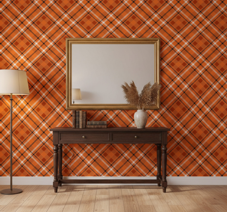 Papel tapiz pasillo cuadrados naranjas con líneas marrones