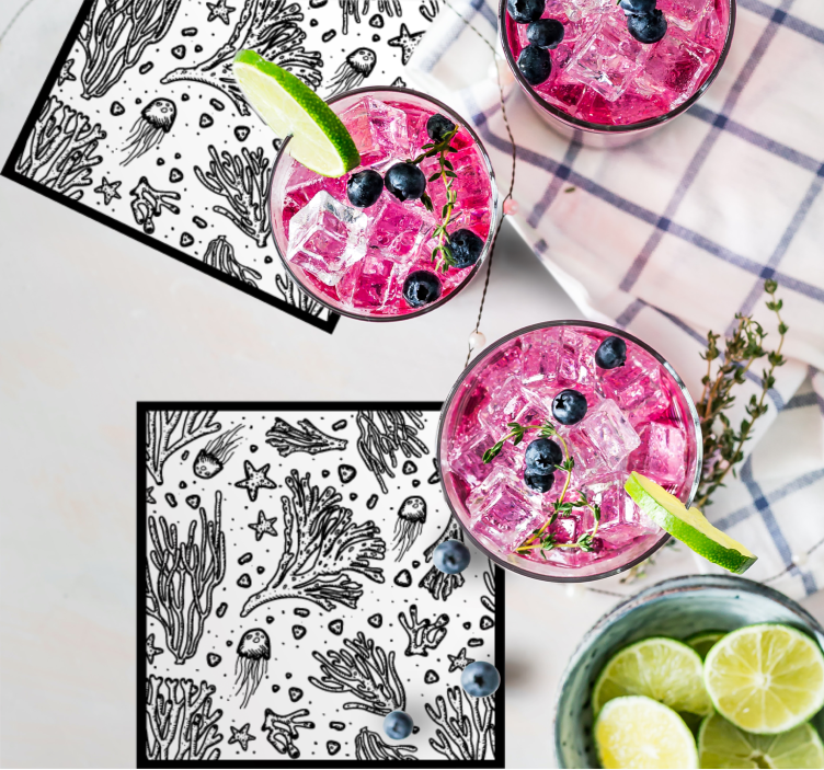 Descubre el arte de la vida marina con nuestros posavasos elementos de vida submarina, donde un diseño cautivador presenta coral, algas marinas, y una medusa flotando en un hermoso patrón en blanco y negro. Este estampado evoca la esencia del mar, adornado con estrellas que representan la inmensidad del océano y la vida marina que habita en sus profundidades. ¡Un toque de elegancia y frescura para cualquier espacio!