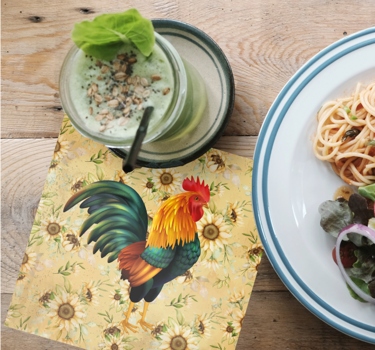 Descubre la alegría de la vida en la granja con nuestros posavasos frikis ilustración de gallo colorido. Este diseño vibrante presenta un gallo y un pollo rodeados de girasoles y elementos florales que irradian colores intensos, transformando cualquier espacio en un rincón lleno de energía y frescura. ¡Perfecto para los amantes de los animales y la naturaleza!