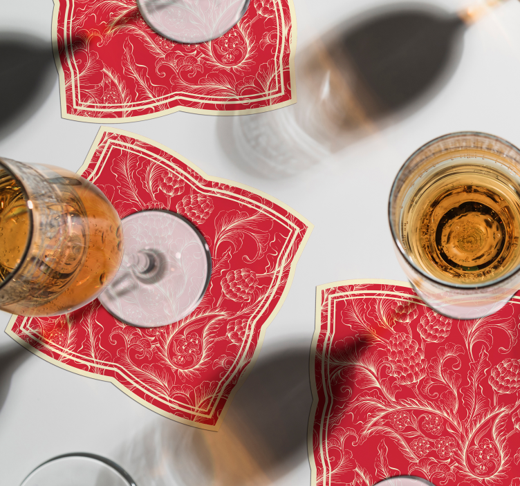 Descubre la elegancia en cada rincón de tu hogar con nuestros posavasos patrón floral ornamental. Este exquisito diseño presenta un hermoso patrón de cachemir que evoca la belleza de la naturaleza. Con un estampado floral en tonos rojos, cada pieza es un deleite visual que combina un marco sofisticado y una textura exquisita, aportando un aire de distinción a tus momentos de relax.
