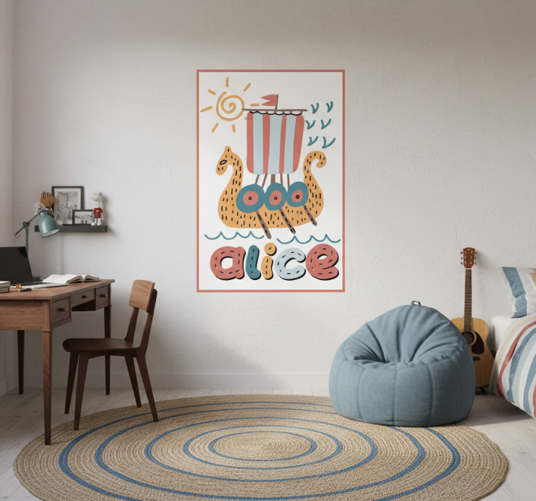 Referencia: G747Descubre la magia del Poster habitación juvenil barco vikingo personalizado, una obra de arte que transformará cualquier espacio juvenil. Este diseño presenta un barco vikingo navegando por mares de ensueño, rodeado de detalles vibrantes y un acabado semimate que resalta su alta intensidad de color. Con un gramaje de 180g/m2, este póster es perfecto para dar vida a la habitación de tus jóvenes aventureros.