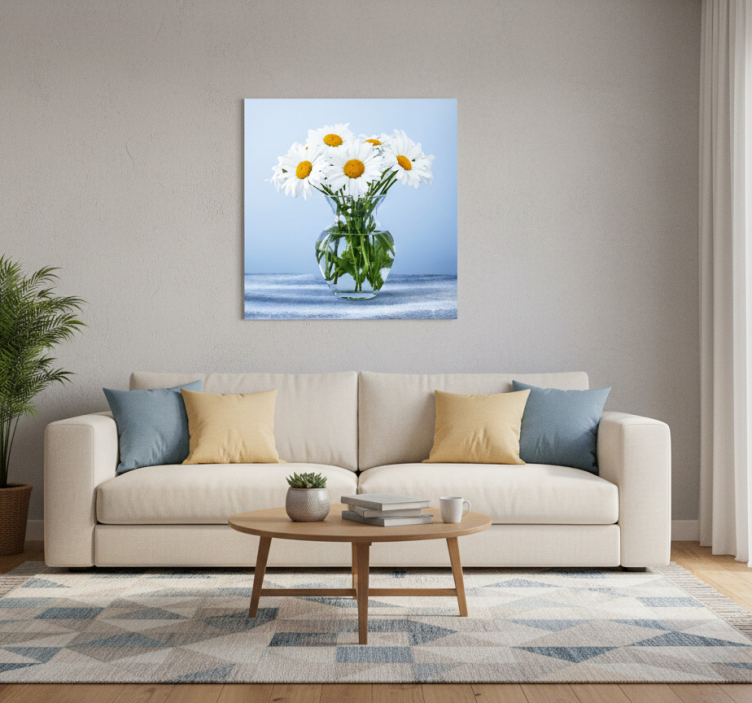Para disfrutar plenamente del Poster salón flores de margarita en macetas de vidrio, la mejor opción es utilizar cinta adhesiva de doble cara en la parte posterior. También puedes enmarcarlo para darle un toque más sofisticado. Simplemente pega las tiras en la parte posterior y sostén cada tira firmemente durante 10 segundos. Alternativamente, las chinchetas y el blu-tack reutilizable son grandes opciones para un montaje sencillo y efectivo.