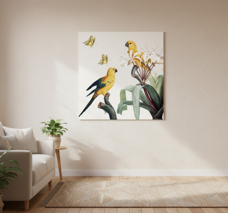 Poster salón loros con flores amarillas y mariposas