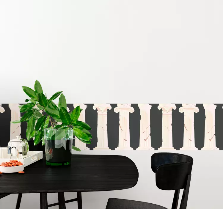 Descubre la elegancia atemporal de nuestra cenefa adhesiva diseño de columna clásica, que evoca la grandeza de la arquitectura antigua y griega. Con un diseño que imita columnas de mármol sobre un fondo negro, esta cenefa es perfecta para aquellos que buscan un toque tradicional y sofisticado en su interior. Su estilo elegante y clásico transforma cualquier espacio, creando una frontera visual que cautiva la atención.