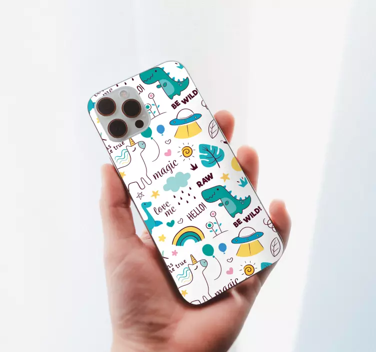 Descubre la magia de nuestra Pegatina iPhone patrones de criaturas fantásticas, un diseño encantador que presenta dinosaurios, un unicornio, y un patrón lleno de estampados que transformará tu teléfono en un objeto de fantasía. Este movil se convertirá en una pieza única y linda que atraerá todas las miradas gracias a su estilo vistoso y mágico.