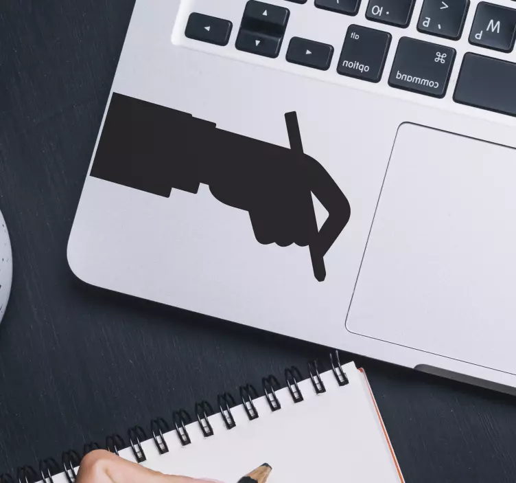 Descubre la pegatina para portátil mano sosteniendo lápiz, un diseño único que representa una silhouette creativa de una mano sosteniendo un lápiz mientras escribe. Esta silhouette negra se integra perfectamente con cualquier ordenador portátil, aportando un toque artístico y moderno que transforma la apariencia de tu dispositivo en una expresión de tu creatividad.