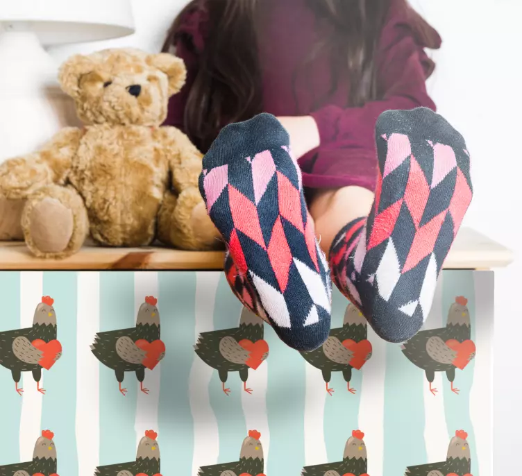 Descubre la belleza del vinilo animal de granja patrón de gallinas encantadoras, un diseño que captura la esencia de la vida campestre. Con la presencia de gallos y pollos adorables rodeados de corazones y rayas, este patrón es perfecto para dar un toque lindo y vistoso a tus muebles. ¡Es la elección ideal para los amantes de la decoración rústica!