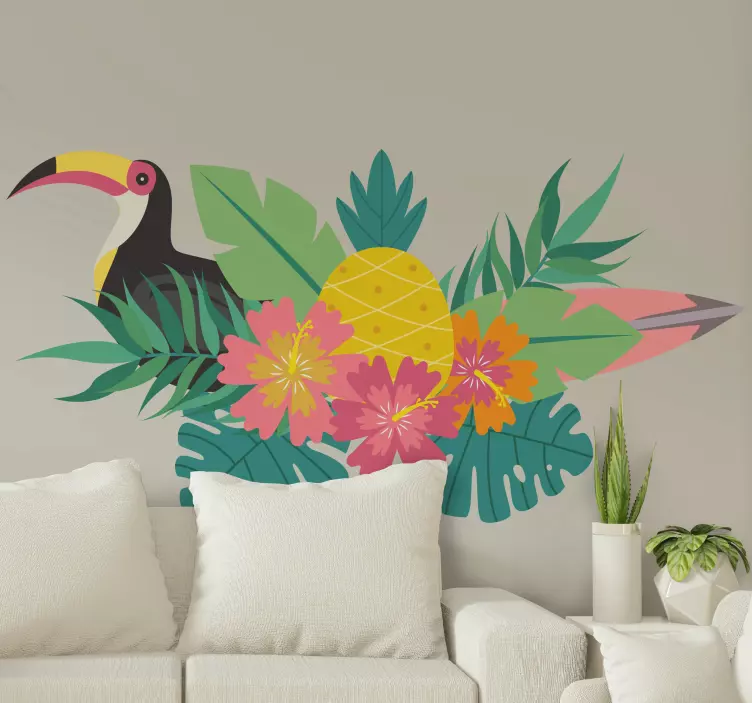 Descubre la belleza exótica de nuestro Vinilo animales diseño de aves tropicales, que trae a tu espacio un estallido de colores vibrantes. Este diseño presenta un encantador tucán rodeado de hojas y flores tropicales, todo en un entorno de verdor que evoca la frescura de la naturaleza. Con elementos como piñas y un sinfín de tonalidades alegres, este vinilo se convierte en la pieza central perfecta para cualquier habitación. ¡Dale vida a tus paredes con un toque de alegría tropical!