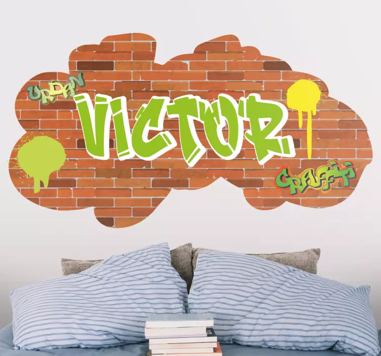 Descubre la magia del Vinilo cabecero nombre urbano personalizado, una pieza única que transformará tu espacio. Con un diseño que evoca el arte de la calle, este vinilo presenta una vibrante textura de grafiti y graffiti, ideal para aquellos que buscan un toque urbano y vistoso en su decoración. La representación de nubes y la pared de ladrillo realzan su estilo personalizable, convirtiéndolo en una obra de arte callejera que se adapta a tu personalidad.