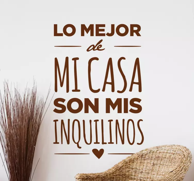 Selecciona las medidas que mejor te convengan para este sticker y escoge uno de los muchos colores en acabado mate que ponemos a tu disposición. Vinilos pared ideales para tu recibidor, el comedor o el salón con el texto "lo mejor de mi casa son mis inquilinos".