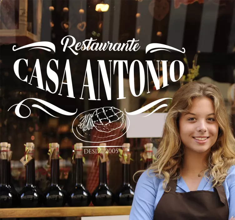 Referencia: A1613Vinilos restaurantes con un texto personalizable decorado con motivos sinuosos y de tendencia, para darle un toque distinguido y diferenciador a tu lugar con un moderno diseño. Dispones de este vinilos decorativo de contrastada calidad en más cincuenta colores con acabado mate para combinar con el espacio deseado, y puedes escoger entre varios tamaños para adaptarse a las dimensiones de tu rincón designado. Si no encontraras el que mejor te va para tu caso, contáctanos y te lo adaptaremos sin problema. No olvides indicarnos el nombre de tu negocio para personalizar tu pedido en el apartado correspondiente