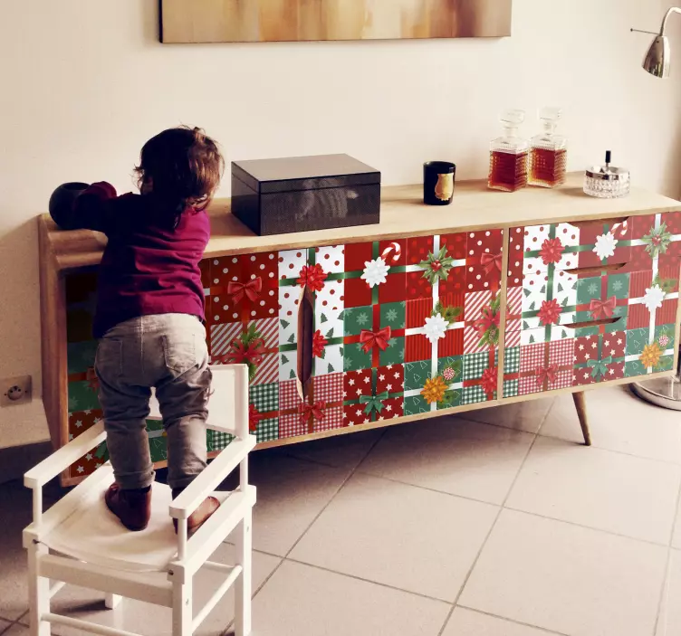 El vinilo embalaje de regalo celebratorio presenta un diseño vibrante y festivo que captura la esencia de la Navidad. Con un patrón de cuadrícula en tonos de rojo y verde, este estampado alegre está adornado con lazos decorativos que evocan la calidez de los regalos bajo el árbol. Ideal para embellecer muebles y crear una atmósfera mágica en cualquier rincón de tu hogar, este vinilo transforma la presentación de tus obsequios en una experiencia visualmente deslumbrante.