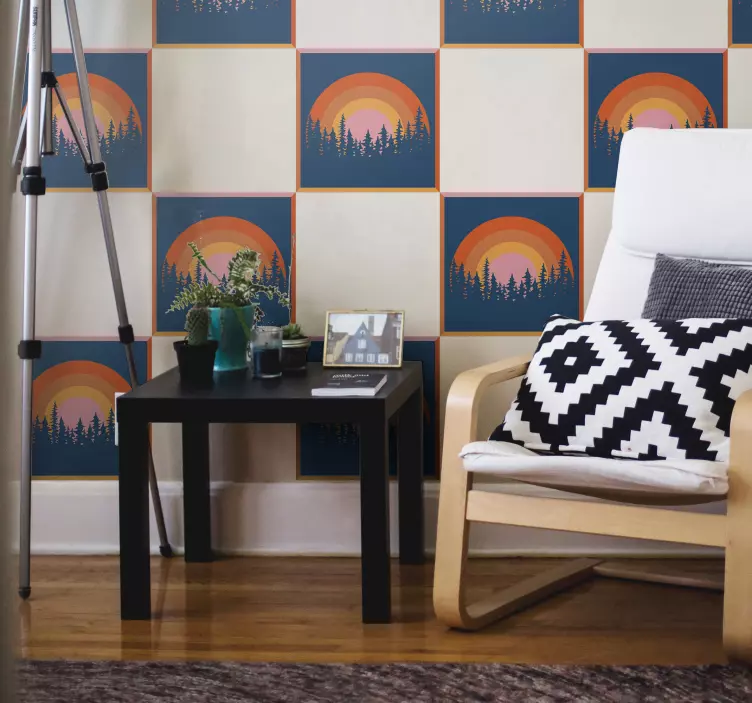 Descubre la magia de la naturaleza con nuestro vinilo escena de bosque al atardecer, un diseño que captura la esencia de un atardecer radiante en medio de un bosque vibrante. Este hermoso paisaje presenta un sol dorado que se asoma entre los árboles, creando un juego de luces y sombras que resalta los ricos colores de la naturaleza. Con un acabado que simula azulejos, cada detalle se convierte en una obra de arte visual que transforma cualquier espacio en un refugio acogedor y lleno de vida.
